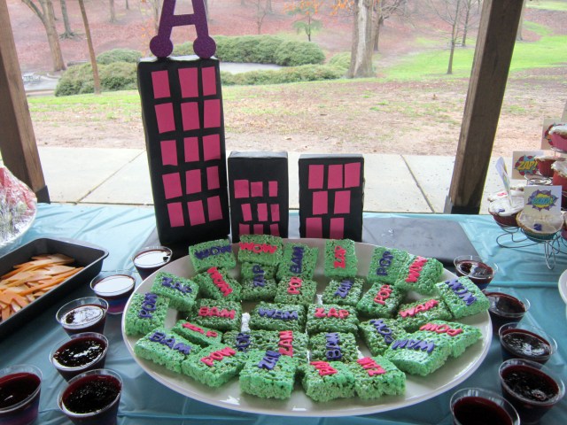-I especially liked the rice krispie treats. I’d used gluten-free rice krispies and had followed the directions on the box, adding green food coloring after the marshmallows melted. I’d purchased colored fondant and letter shaped cookie cutters, We cut out three and four letter “super” words like “Zap!”, “Pow” and “Wham!” and had used a tiny bit of frosting applied with a toothpick to stick the words onto the treats.