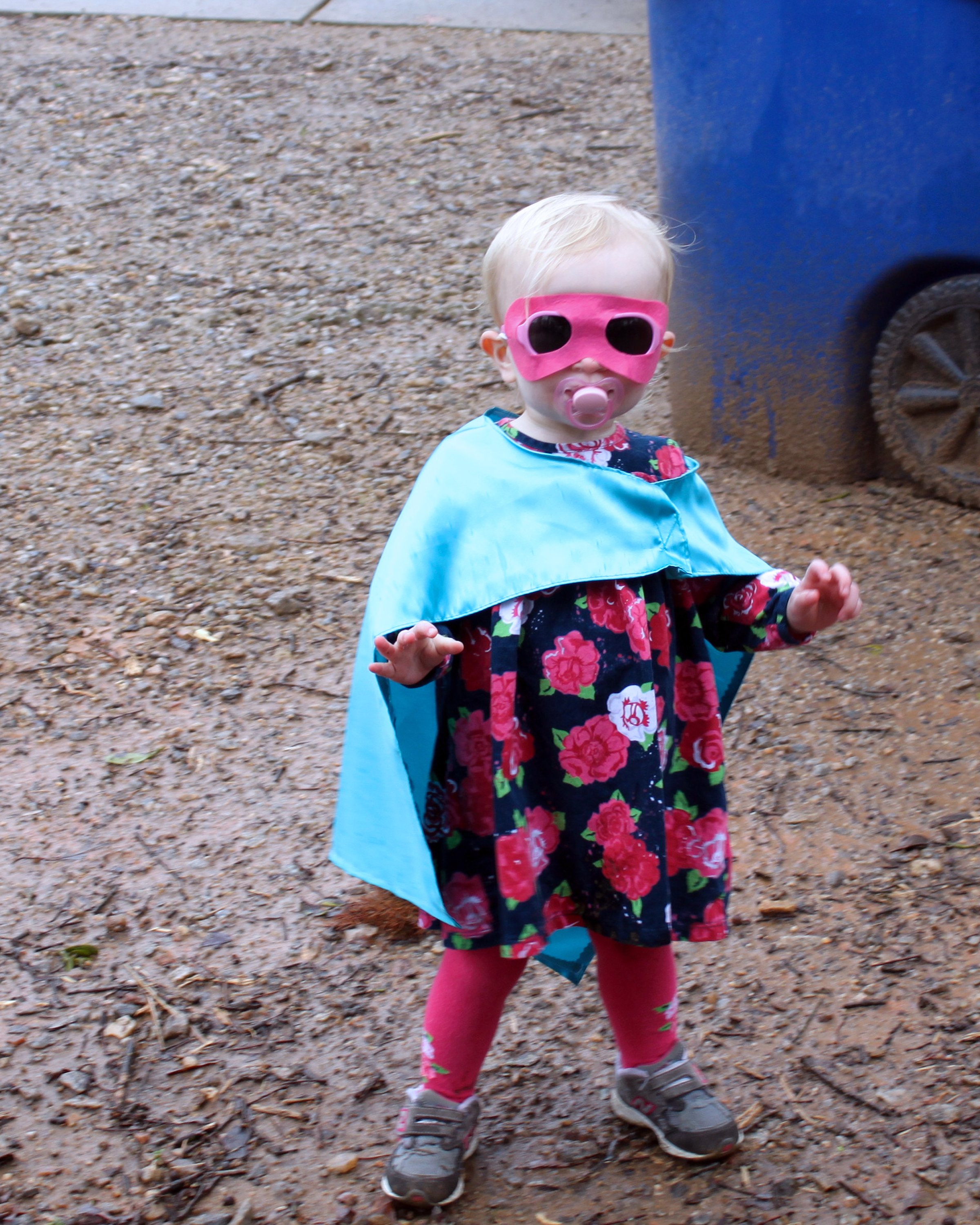 We don’t often talk about superheroes in my house, with my two little belles. We spend hours talking about the lives of all the Disney princesses, the princesses in their books and of women in the Bible. Last Spring, however, A (almost 2) started putting her washcloth on her back and shouting that she was coming to the rescue! It was so stinkin’ cute, I couldn’t resist throwing her a ‘Super’ birthday party. I started by placing an order for superhero capes and masks from Capes and More on Etsy and am delighted when I still see little heroes zipping around our neighborhood six months later – imagine a party favor that gets used! I also contacted Lowes and had them save a refrigerator box for me. After all, we needed a phone booth in which to change.